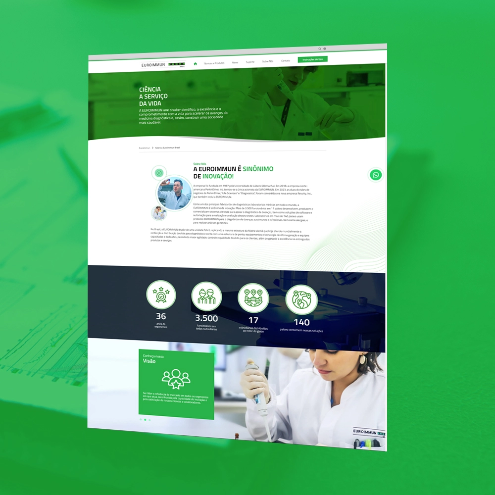 EUROIMMUN Brasil, braço nacional de uma das maiores líderes mundiais em soluções para diagnóstico laboratorial, precisava de um site institucional robusto, informativo e escalável, capaz de apresentar centenas de produtos de forma organizada e acessível. O desafio era estruturar uma plataforma que comunicasse com clareza o alto nível técnico da empresa, ao mesmo tempo em que proporcionasse uma navegação fluida e intuitiva para laboratórios, distribuidores e profissionais da saúde.