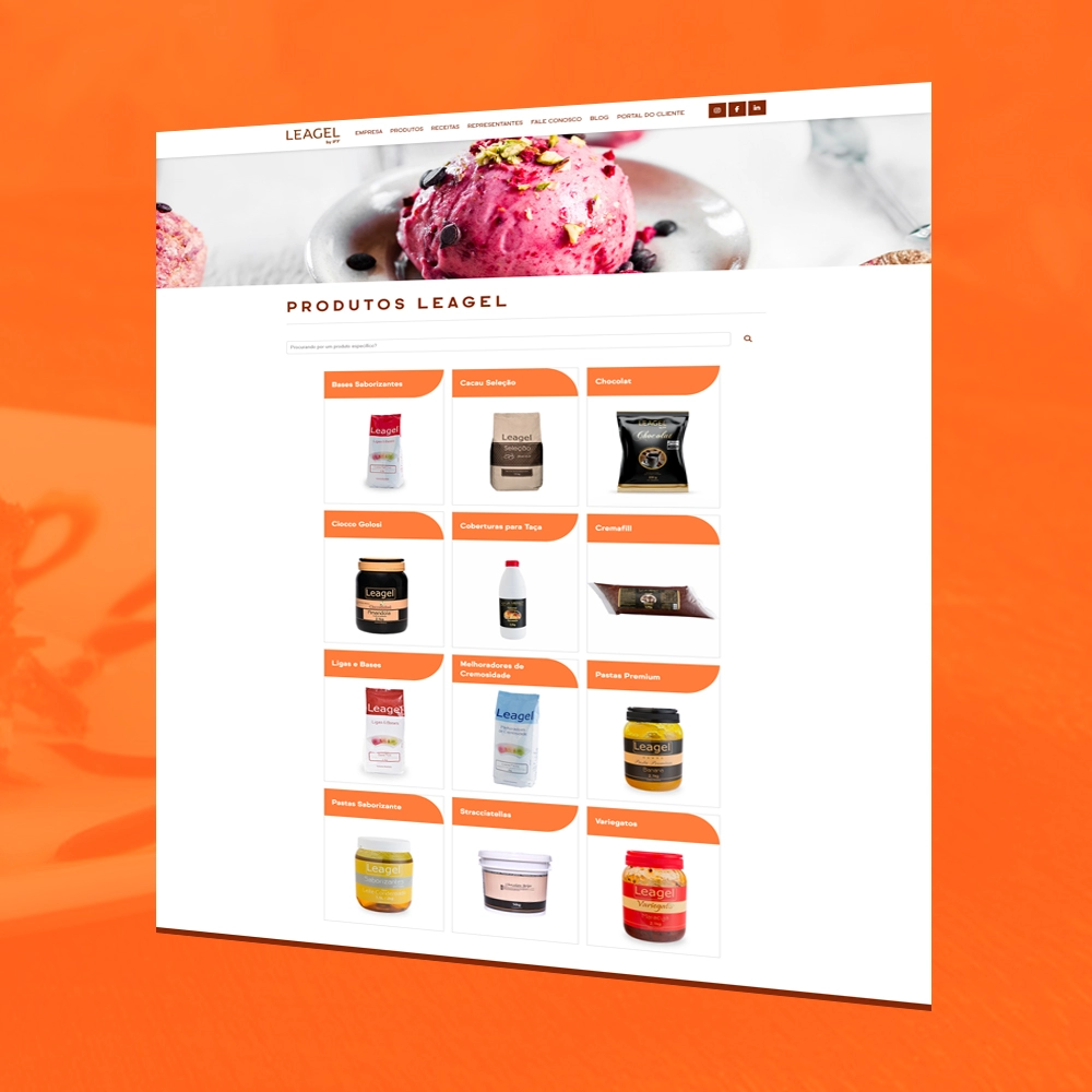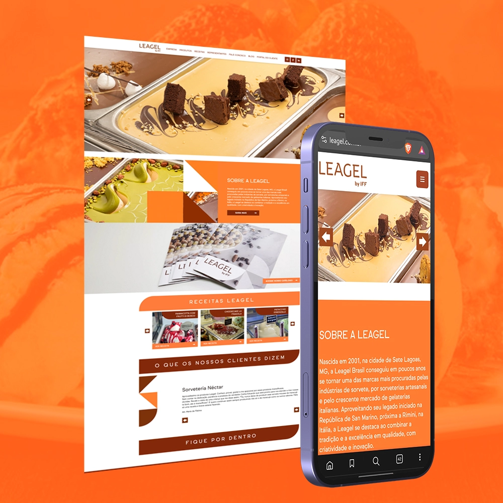A seção de produtos apresenta com riqueza de detalhes os ingredientes e soluções oferecidas pela Leagel para o mercado de sorvetes e confeitaria, enquanto a área de receitas conecta a tradição com a criatividade, oferecendo sugestões práticas para aplicação dos produtos. O Portal do Cliente oferece acesso exclusivo e prático para parceiros e clientes da marca.
