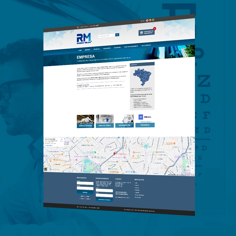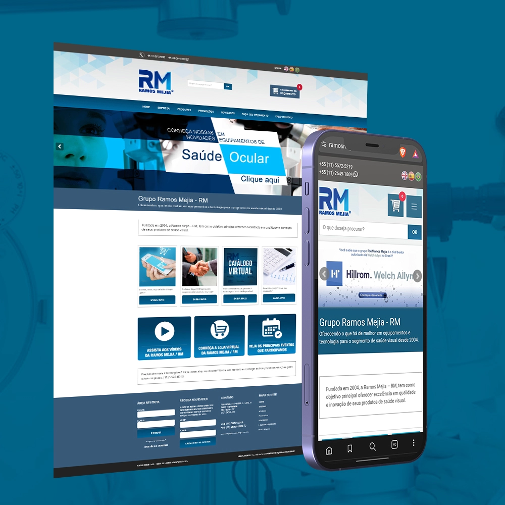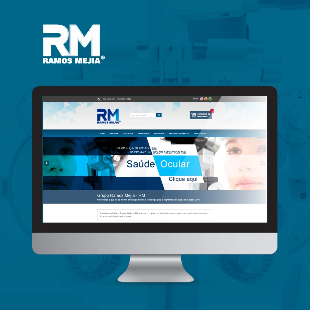 A Ramos Mejia, detentora da marca RM, atua desde 2004 no fornecimento de equipamentos e acessórios para profissionais da saúde visual, sendo reconhecida pela qualidade de seus produtos e pelas parcerias com grandes fabricantes internacionais. Com uma trajetória marcada pela inovação e pela expansão do portfólio, a empresa precisava de um site institucional que apresentasse sua história, catálogo de produtos e novidades de forma clara, profissional e acessível.