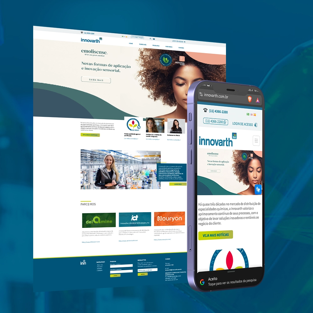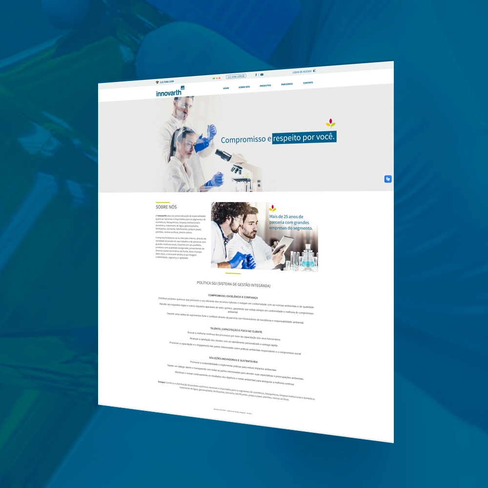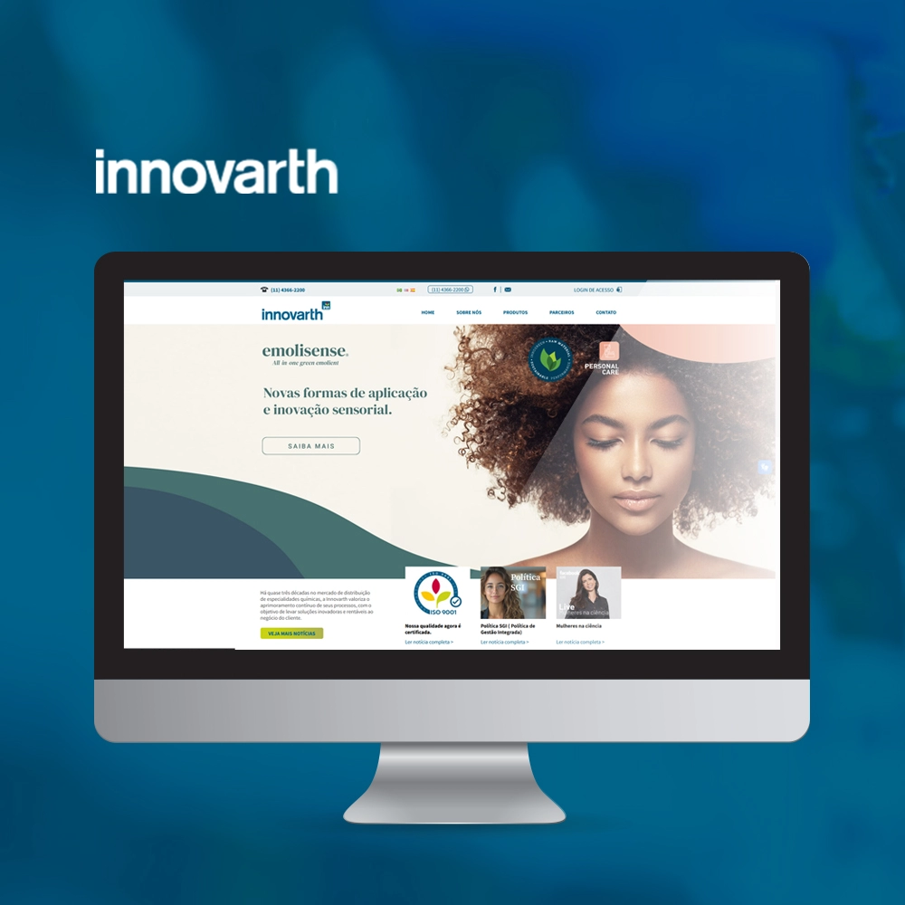 A Innovarth atua na comercialização de especialidades químicas nacionais e importadas, atendendo diversos segmentos industriais como cosméticos, fotoquímicos, limpeza, tratamento de água, galvanoplastia, fertilizantes, petróleo, entre outros. Com forte presença no mercado interno e um portfólio composto por produtos de alta qualidade provenientes da América do Norte, Ásia e Europa, a empresa precisava de um site institucional à altura de sua atuação técnica, com foco em visibilidade digital e autoridade de marca.